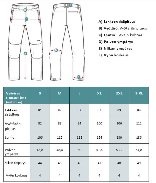 Housuissa on kaksi vetoketjullista sivutaskua sekä kiristettävät lahkeensuut.
