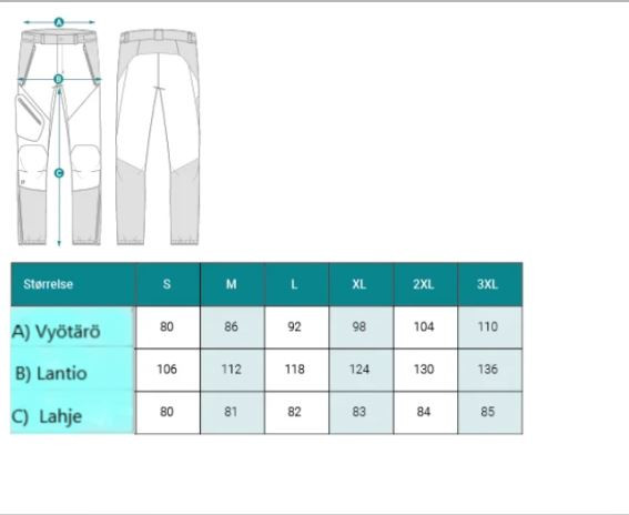 Polvien ja takamuksen muotoiltu materiaali antaa lisää liikkumisvapautta. Tarranauhoin säädettävä vyötärö takaa mukautetun istuvuuden lantiolla ilman vyötä. Lahkeessa vetoketju ja kuminauha jotka helpottavat esim maihareiden kanssa käytettäessä. Kaksi sivutaskua ja reisitasku – kaikki suljettavissa vetoketjulla.