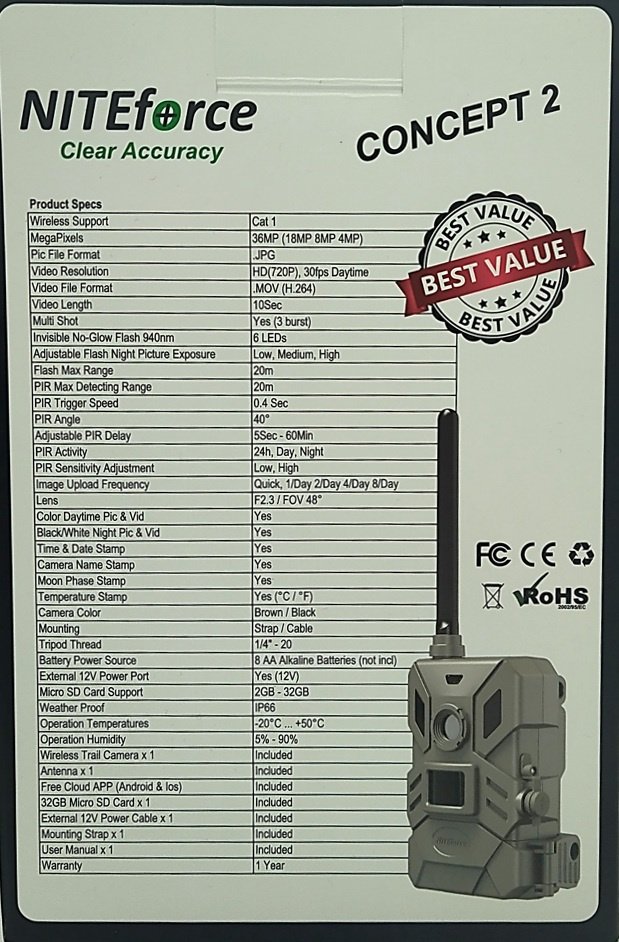 NITEforce Concept 2 36MP on kompaktin kokoinen etäohjattava riistakamera monipuoliseen käyttöön kuten riistakuvaus tai valvontakameraksi kiinteistöihin. Lähettävä riistakamera pitää sinut aina ajan tasalla mitä kohteessa tapahtuu, olitpa sitten missä tahansa!