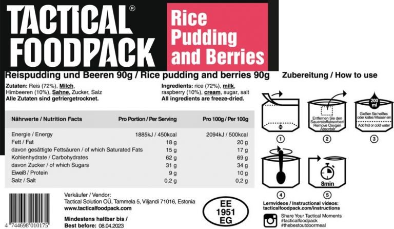 Tactical Foodpack retkiateriat sisältävät suuren energiamäärän ja ne on pakattu vesitiivisiin, retkivalmiisiin ohuisiin pakkauksiin. Ateriat on valmistettu pakastekuivaamalla, joka säilyttää tuotteen maun, koostumuksen ja ravinteet parhaiten. Ateriat on valmistettu Virossa ilman säilöntä- ja lisäaineita.